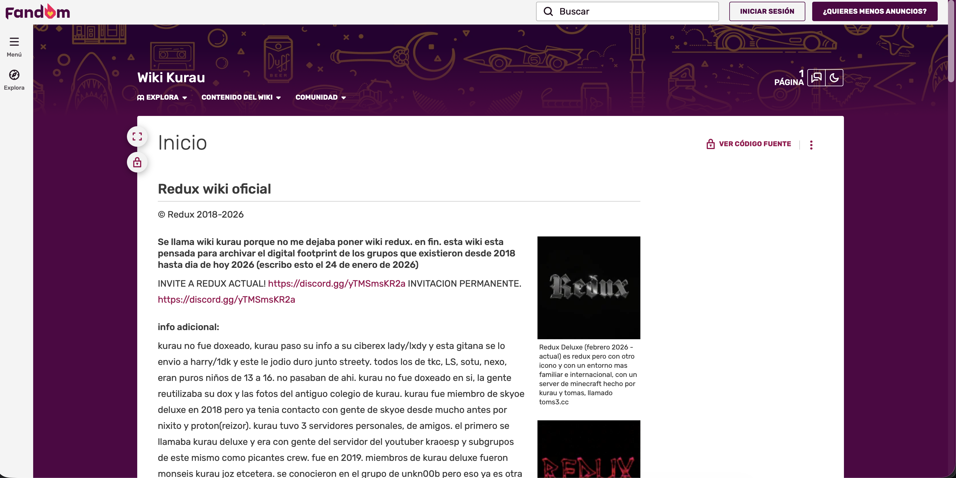 | 21:33 27 feb 2026 | ¿Quien es si20?.jpeg (archivo) | 21 kB | LBNia16 (discusión | contribs.) | Si20 es un adulto con un server de discord llamado Legion Brillosa, creada en 2022 el mes 3 de diciembre, un dato curioso y es que en el server han aparecido pedófilos y muchas cosas, yo soy un staff de ese server y por lo que e visto hay cosas muy interesantes y antiguas con la que se puede hacer iceberg, entonces yo digo que los responsables de que el server sea medio famoso es por los 2 pedos que conozco son: Sonick Jung honk pst: que diferencia hay entre la ps4 y la ps4 ultramegahiperreal… | 1 | |